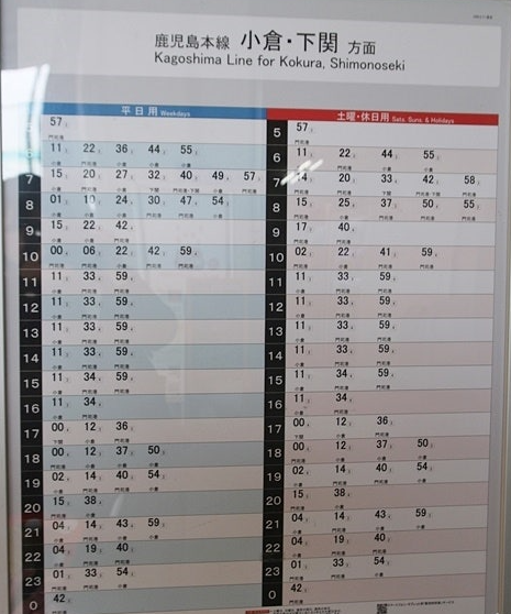 숙소가 있는 고쿠라역으로 돌아가는 전철시간표입니다(파란색은 평일, 빨간색은 주말입니다)