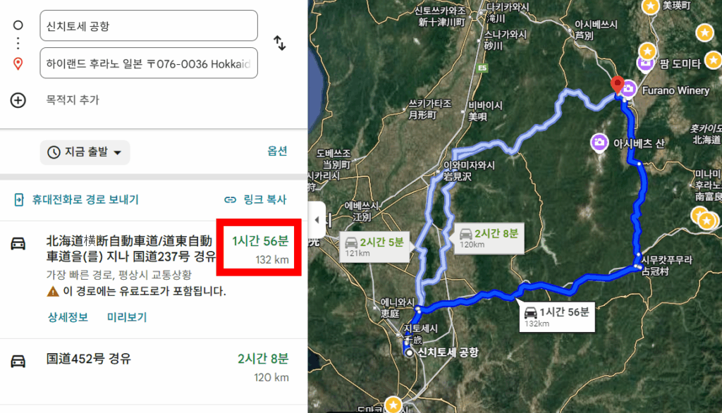 렌터카 기준, 신치토세 공항에서 대략 2시간 거리이다(130km)