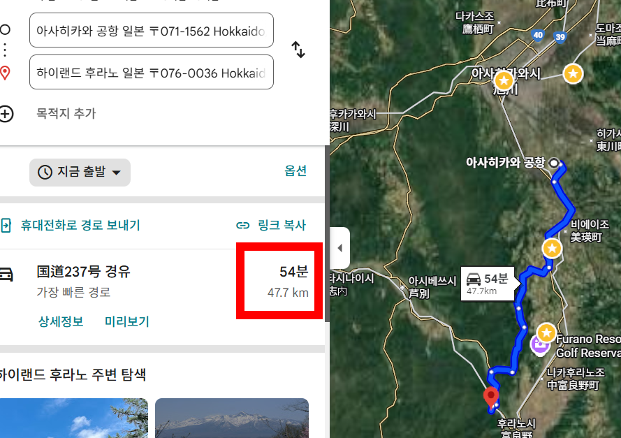 그러실 분들은 거의 없겠지만, 아사히카와 공항에서의 거리도 살펴보자.